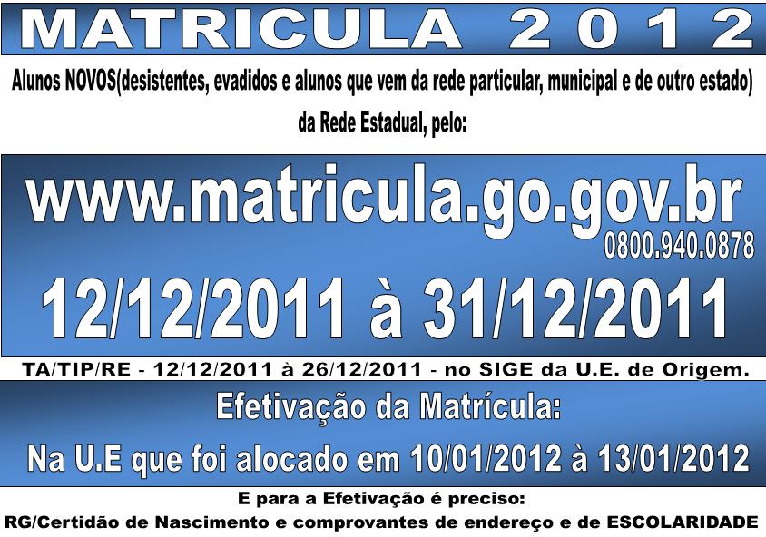 Dia 12 de dezembro de 2011, inicia-se a solicitação de matrículas para rede estadual de ensino do Estado de Goiás e conclui-se em 31/12/2011. Esta solicitação é feita pelo www.matricula.go.gov.br e/ou pelo 0800.940.0878. Este procedimento é somente para os alunos novatos, ou seja, alunos que vão iniciar seus estudos ou oriundos de outro estado, município, rede particular e ainda alunos evadidos/desistentes.